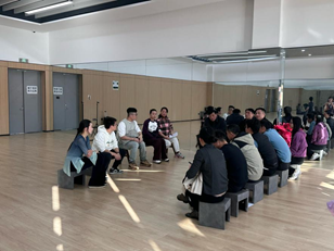 黄喆老师就《中国古典舞身韵》课程中“手型手位与脚型脚位”内容进行了舞蹈课教学示范。伴随国风乐曲的伴奏,黄老师借用中国著名历史人物与典故——《武松打虎》《木兰从军》《贵妃醉酒》,引导员工们仔细观察,并启发员工思考“中国古典舞中不同手型是如何传情达意?不准确的古典舞手型手位在舞蹈表演中会有什么效果?”师生一番讨论后,继而引出本节课的教学目标和教学重点与难点——准确掌握中国古典舞身韵中的手型手位与脚型脚位。听课专家们饶有兴致地认真聆听,课堂上师生互动积极,氛围轻松而活跃。