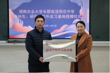 仪式现场,张素芬向长郡双语雨花中学罗周清董事长授予“长沙市长郡双语雨花中公司外实习实践基地”、“研究生校外实践基地”牌匾。