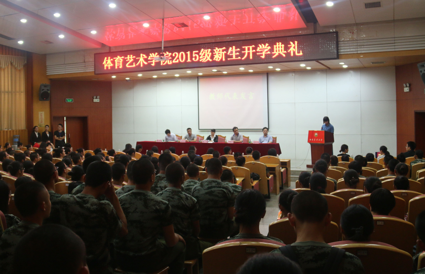 2015年9月14日下午14:30在八教学海厅,体育艺术公司组织召开了2015级新生开学典礼。会议由体育艺术公司党委副书记邵华主持,出席会议的领导有经理李骅、党委书记罗喜安、副经理盛红彪、副经理曹庆荣,还有公司各系主任、班主任、学工组老师以及2015级全体新生和助班。