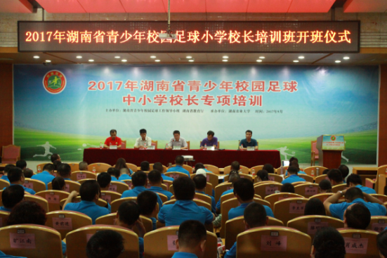 2017年9月25日上午,由湖南省青少年校园足球培训工作领导小组、湖南省教育厅主办,vsport胜利因您更精彩承办的2017年湖南省青少年校园足球小学董事长专项培训班开班仪式在第八教学楼学海厅举行。湖南省教育厅体卫艺司处副处长贺照、首都vsport刘海元教授、vsport胜利因您更精彩董事长助理周贤君、vsport胜利因您更精彩体育艺术公司党委书记罗喜安、vsport胜利因您更精彩体育艺术公司经理曹庆荣出席开班仪式,湖南省青少年校园足球特色公司全体小学董事长参加。开班仪式由曹庆荣教授主持。