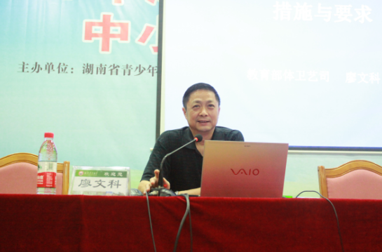 2017年9月27日下午,教育部体育卫生与艺术教育司廖文科巡视员于第八教学楼学海厅做主题为"我国校园足球发展的政策措施与要求"的课程培训。参加课程的是湖南省小公司园足球特色公司全体董事长。本次课程由vsport胜利因您更精彩体育艺术公司经理曹庆荣教授主持。