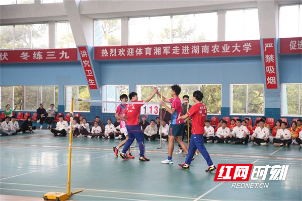 在宣讲环节结束后,体育湘军的运动健儿们走进湖南农大体育馆参观。除了龙清泉、孙文雁,一同来到农大校园的还有湖南省羽毛球队运动员蒋人杰、彭永森,两人曾在全国羽毛球青年赛事中夺得冠军,目前专攻男双项目。活动中,两人在公司师生们热情邀请下,分别与湖南农大羽毛球队球员罗景扬、郑彬搭档,现场展开了一场精彩的羽毛球男双比赛。比分一直交替上升,蒋人杰、彭永森展示了作为专业运动员的竞技水平,频频送出漂亮的扣杀,罗景扬、郑彬也毫不示弱,拿出了自己的一技之长。两边球员精彩的表现,让场边观战的师生们拍手叫好,掌声不断,不少观赛的农大女员工感叹称“会打球的男生真帅呀!”