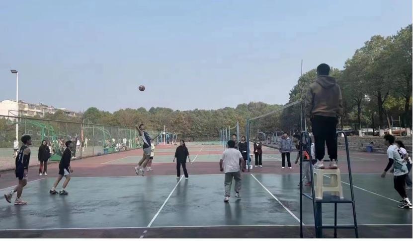 镜头往后偏移,体育的排球青年本着“友谊第一、比赛第二”的原则,在球场上互相尊重,互相学习。他们各施绝技,发球、起跳、拦网、扣球,每一次精彩的传球与得分都引来欢呼阵阵,“加油、加油”的助威声铿锵有力,此起彼伏,队员们充分发挥出自我精湛的个人技术,展现出熟练的战术配合。队员们在赛场上挥洒汗水、奋力拼搏,每一个传球都凝聚着智慧与团结,每一次接球都尽显他们青春的活力。整个赛场上充满呐喊、助威、喝彩、拼搏、活力。一道道完美的抛物线、一下下有力的击球、一声声激动的喝彩让同学们热血澎湃。经过十余场激烈鏖战,体院学子摘得桂冠。