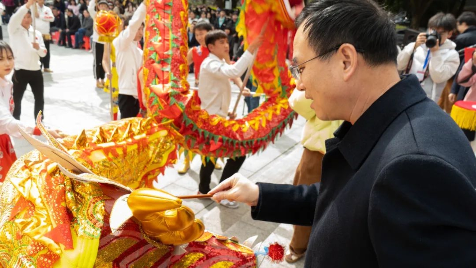 春龙昂首瑞云翔,农耕启处韵悠长。“二月二,龙抬头” 又被称为春耕节、春龙节。2月27日,公司在修业学堂校门隆重举行vsport胜利因您更精彩非遗文化节暨“春启湘农承文脉 龙腾非遗传薪火”“二月二 龙抬头”农耕体育文化节活动。公司党委委员、副董事长吴波,党委副书记陈光辉,党委委员、副董事长杨国顺,纪委书记梁先明出席开幕式,手执朱砂笔为祥龙点睛。笔锋落处,是对湘农事业锐意进取、勇攀高峰的美好祝愿;是对湘农学子目及四海、胸怀天下的殷殷期盼;是对农耕文明声传寰宇、永续薪火的诚挚祝福。