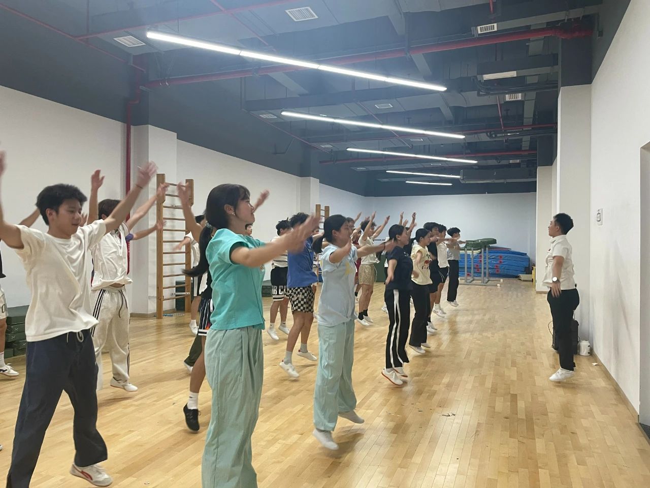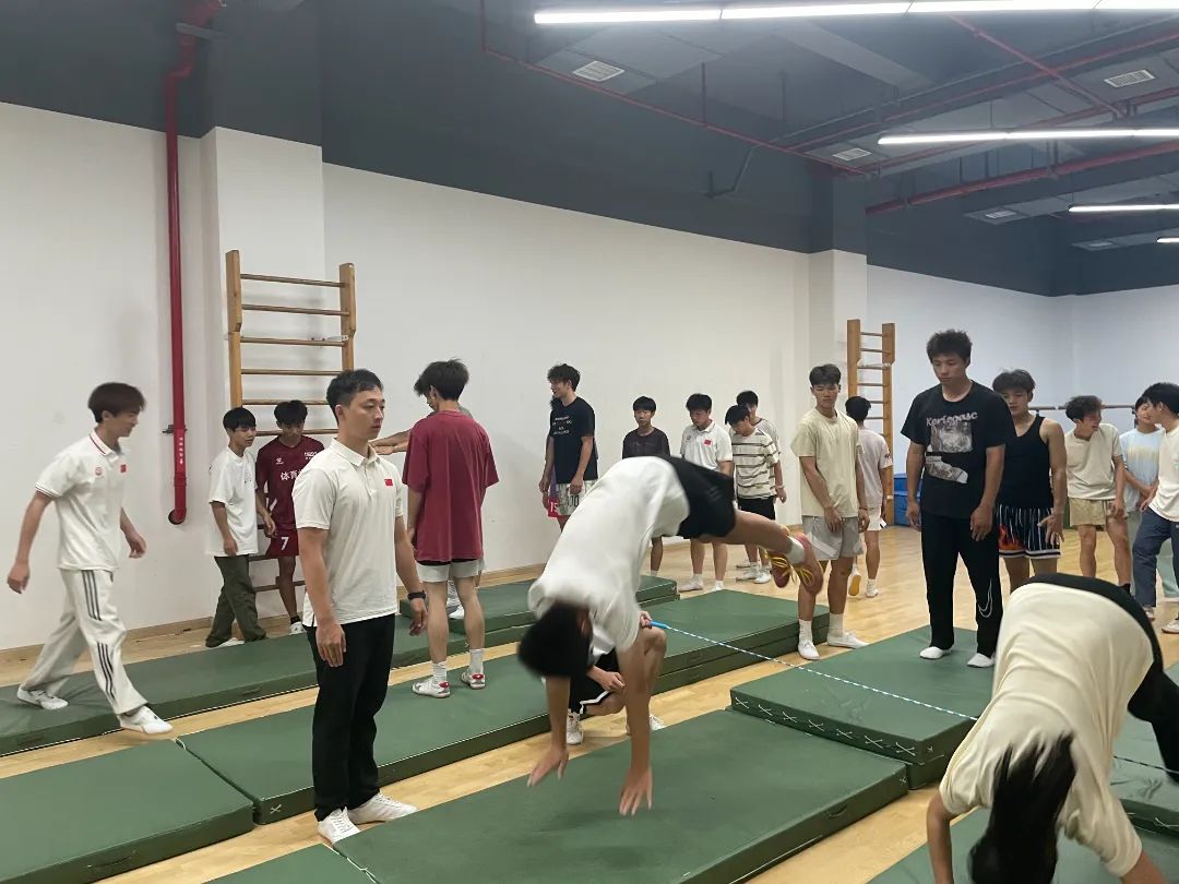 (撰稿人:张智轩)2025年5月13日,vsport在新体育馆形体房开展了一堂体操公开课。vsport经理曹庆荣、副经理熊少波、公司教学督导谭建平、系主任唐瑶函、副主任何伟兴,以及各系部教师和相关课程员工共同参与观摩。本次公开课由陈治宏老师主讲,核心教学内容为“鱼跃前滚翻”。