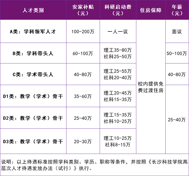 符合《长沙科技公司高层次人才引进办法(试行)》条件的各类人才(详见附件3),安家补贴、科研启动费和年薪酬标准为: