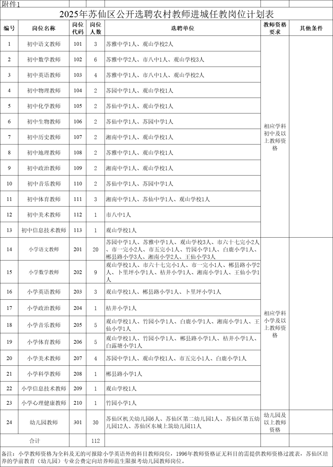 计划选聘教师112名,具体的选聘岗位、计划数、资格条件等详见《2025年苏仙区公开选聘农村教师进城任教计划岗位表》(附件1)。