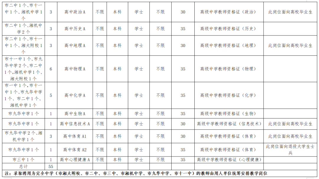 3.录取聘用为完全中学(市湘大附校、市二中、市三中、市湘机中学、市九华中学、市十一中)的教师由用人单位统筹安排教学岗位。