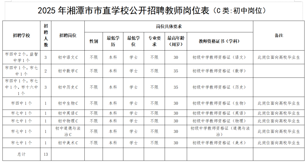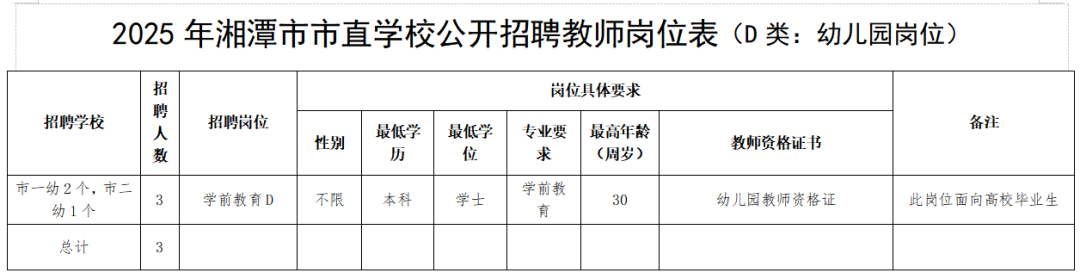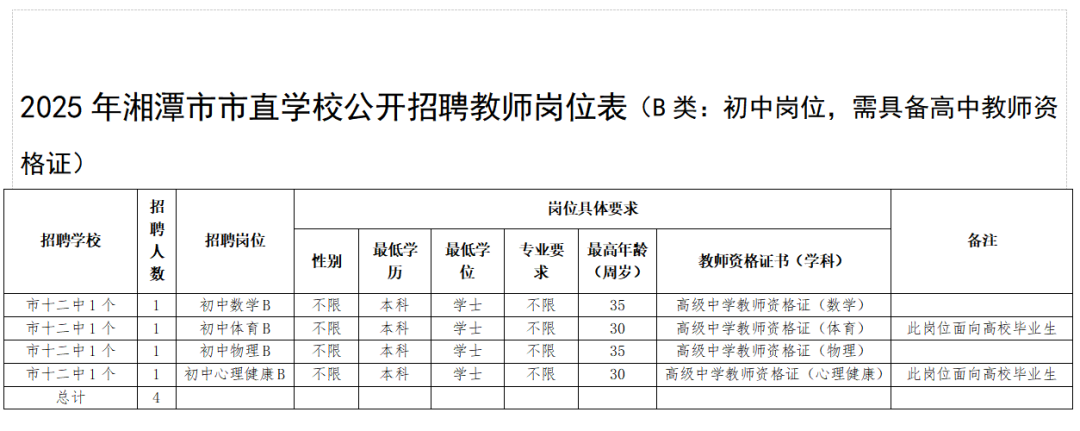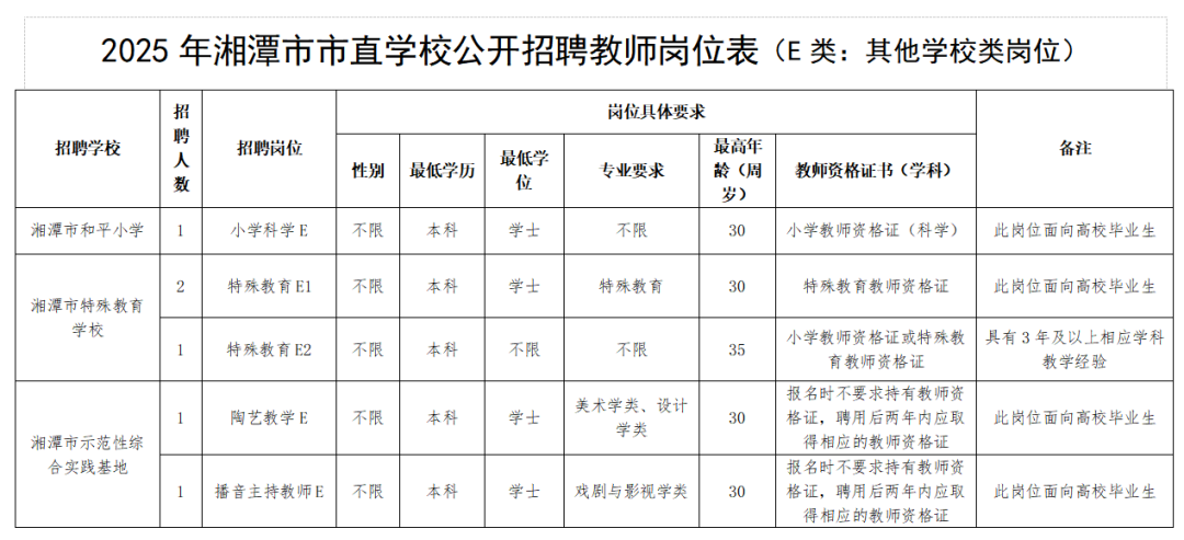 1.本次市直公司公开招聘98名教师,为事业编制教师。其中A类岗位55名,为完全中学、高中教师,A类岗位试教内容为高中;B类岗位4名,均为初中教师(需具备高中教团队格证);C类岗位13名,均为初中教师;D类岗位3名,均为幼儿园教师;E类岗位23名,为小学、特殊教育、实践基地、开放大学、中职、专门公司教师。具体招聘计划与岗位见《2025年湘潭市市直公司公开招聘教师岗位表》(以下简称《岗位表》)。详情可查询湘潭市教育局官网和湘潭市人社局官网。