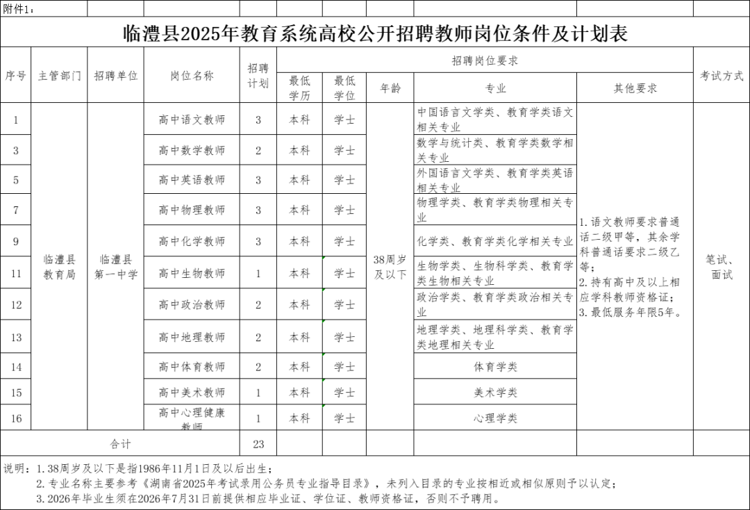 详见《临澧县2025年教育系统高校公开招聘教师岗位条件及计划表》(附件1)。其中: