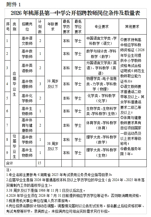 因工作需要,经县委、县政府同意,桃源县第一中学走进湖南师范大学公开招聘教师15名,现将有关事项公告如下: